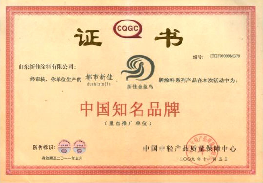 新佳涂料榮獲中國知名品牌稱號